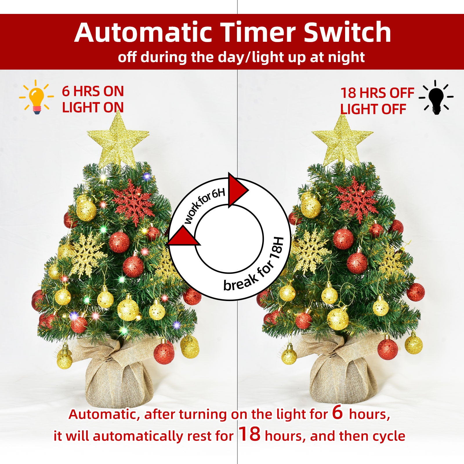 - Lighted Mini Christmas Tree Magic: Enhance your holiday ambiance with our Lighted Christmas tree, featuring 40 warm white LED lights and 8 dynamic lighting modes. The convenient battery box (batteries not included) allows for easy setup and operation. Additionally, The table top christmas trees with lights features a timer function with 6 hours on and 18 hours off, ensuring your tabletop Christmas tree stays illuminated longer. This tabletop christmas tree lighting ensures your home radiates with Christmas cheer.