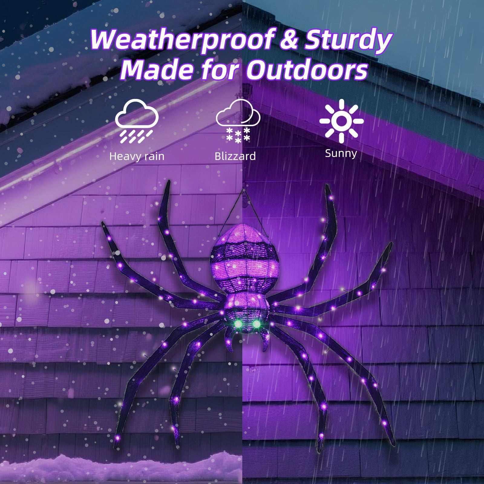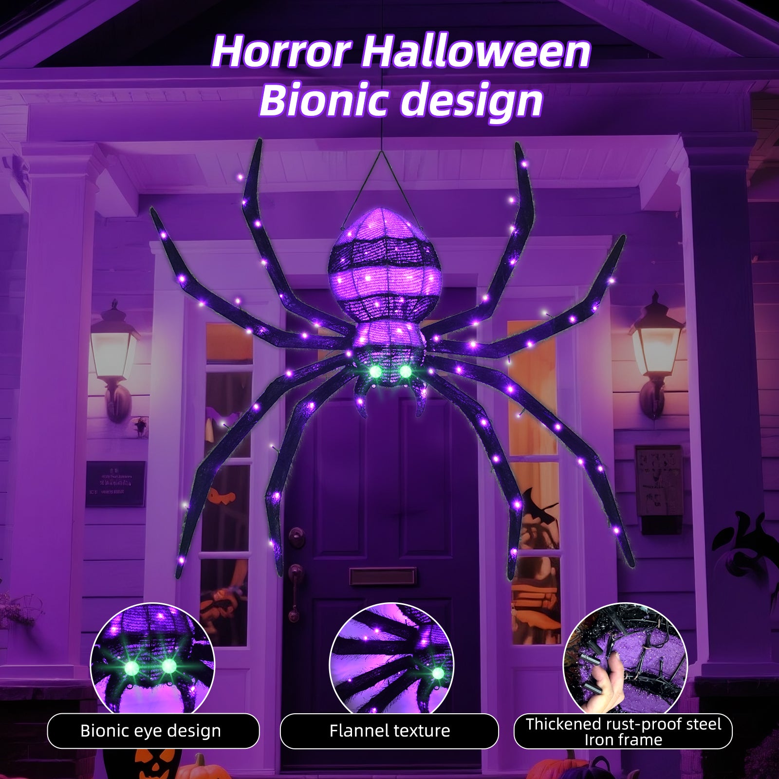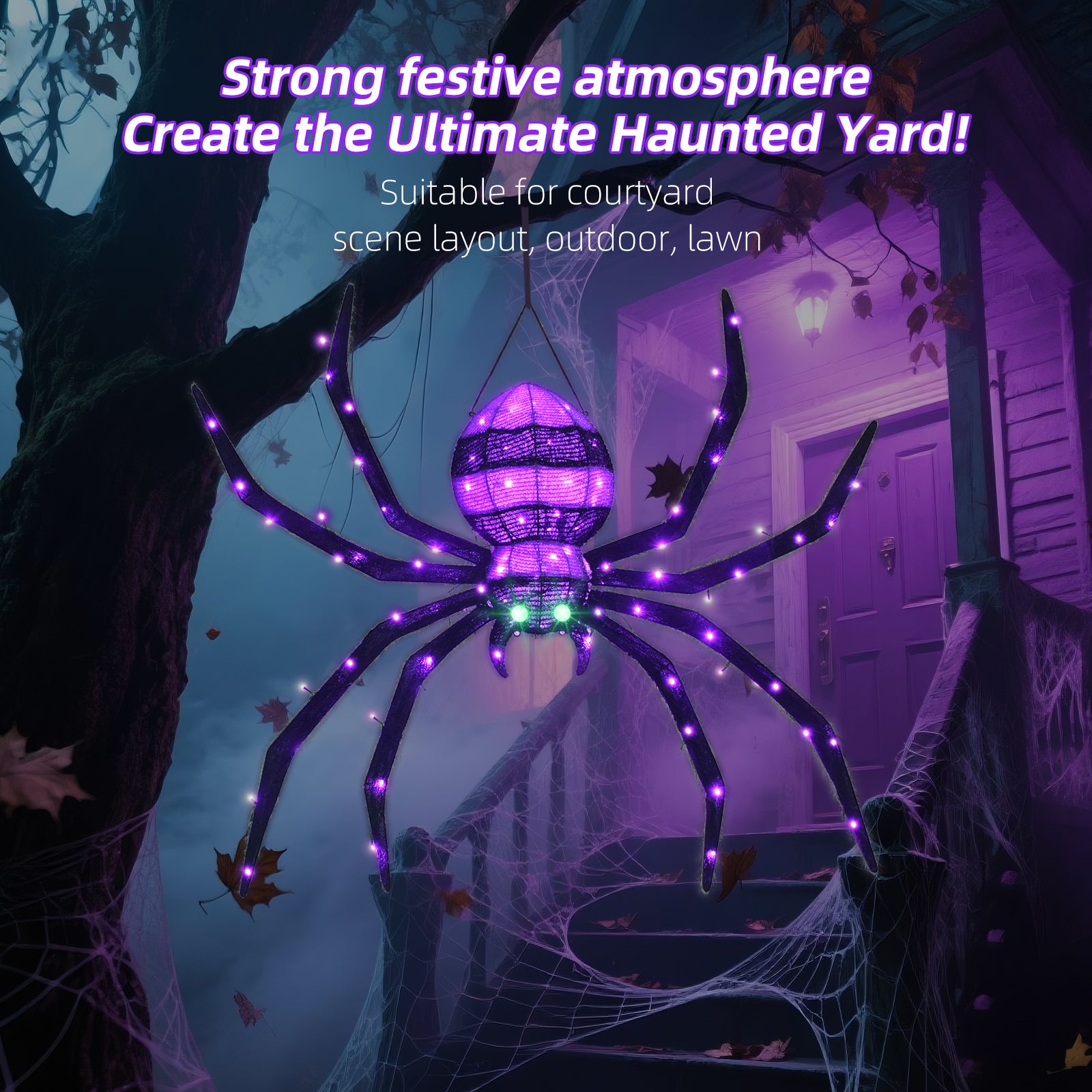 - Lighted Hanging Spider & Stable Power Supply: This Halloween decor-lighted Hanging Spider has 90 LED lights, 88 purple LEDs illuminating its body, and 2 green LEDs for its eyes. The spider's Halloween decorations are guaranteed to send shivers down your spine, which makes it look even creepier with a 100v-240v wide-range power adapter to keep your Halloween outdoor decorations spider-lit all the time.