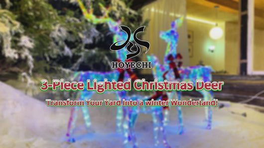 Create a glowing holiday centerpiece with the HOYECHI 3-Piece Lighted Prismatic Reindeer Set — a dazzling 465-LED outdoor décor collection designed to make your yard sparkle from every angle.